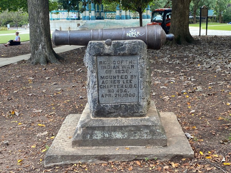 Small and unassuming (considering that it is a weapon of war), the cannon bears only a short inscription: “Relic of the Indian War of 1836.” Children climb on it, play around it, hide behind it. What Indian War? What Indians? Are there “Indians” in Georgia? Were there “Indians” in the past? Who were they? Very few of us White people bother to ask, even fewer to find out.