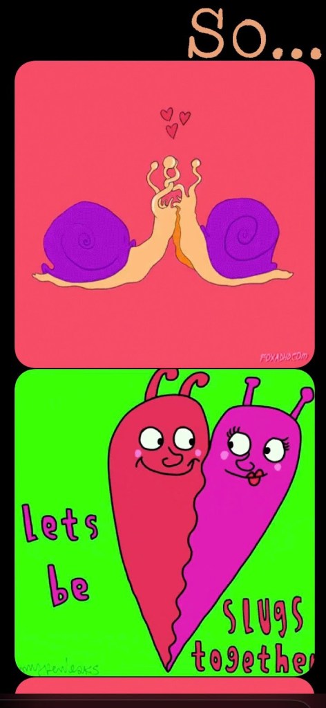On our weekly celebration of Slug Sunday Funday, GIFs about slugs are de rigueur. And every month we celebrate our ‘anniversary,’ because—well, why not, and also because we are both in our early 70s, time is short, and nothing is guaranteed.