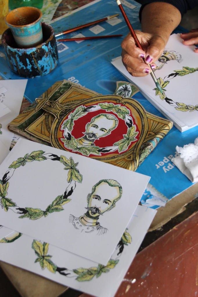 In the middle of the floor was a small square table, surrounded by women talking and laughing and wielding large pairs of scissors. Small cups of dark, sweet Cuban coffee—in 2003, cafe puro was available for a price—sat scattered on the table. In-between were sheets of paper with mimeographed images of faces and oil lamps and flowering plants.